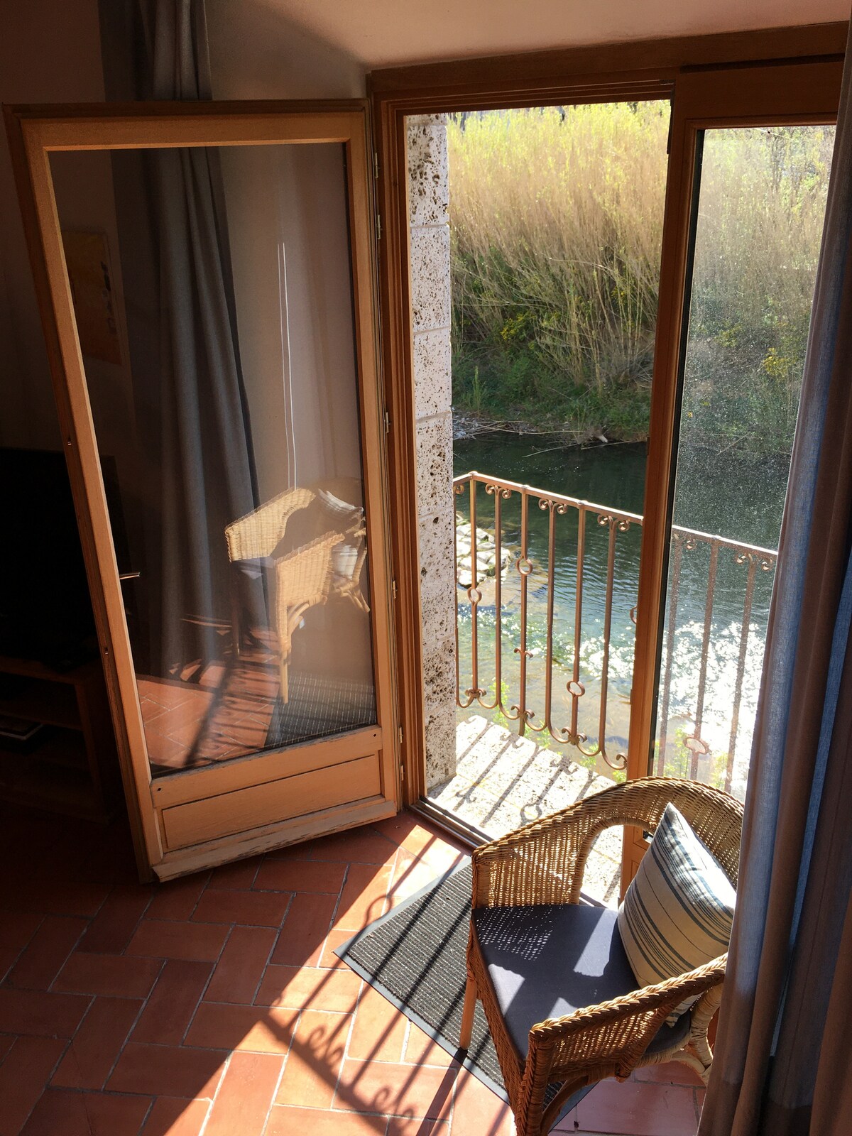 Önemli ön kapıyı açtığınız andan itibaren, Doğa Ana sizi yolun karşısındaki ağaçlarla süslü kireçtaşı kayalıklarının panoramik manzarası ve etrafı açan yemyeşil bitki yaşamıyla davet ediyor. Güvercinler ve salıncaklar sürekli olarak yukarıdaki uçsuz bucaksız gökyüzünde bir ileri bir geri gidip geliyor, horozlar öter, kilise çanları ve Orbieu Nehri, hemen aşağıdaki kayalık plaj ve bahçe terasının yanında akmaya devam ederken gece gündüz dinlendirici bir arka plan müziği sunuyor.