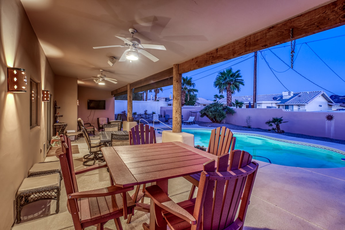 Cennetin bir parçası! 3 yataklı 2 banyolu ev 10 misafir barındırır ve merkezi konumdadır. Londra Köprüsü, şehir merkezi, tekne iskelesi ve parti sevenler için barlara 5 dakika mesafededir! Kapalı veranda alanı / havuzda/spada dinlenirken veya ızgarada yemek pişirirken Bluetooth hoparlörlerle açık havada yemek yiyebilirsiniz! Ön tarafta bolca park yeri, tekneleri ve off-road araçları barındıracak kapalı otopark, bağlantılarıyla karavan park yeri! Her televizyon Netflix ile yayın yapmaya hazır! Tam donanımlı mutfak. Daha fazla aramayın.