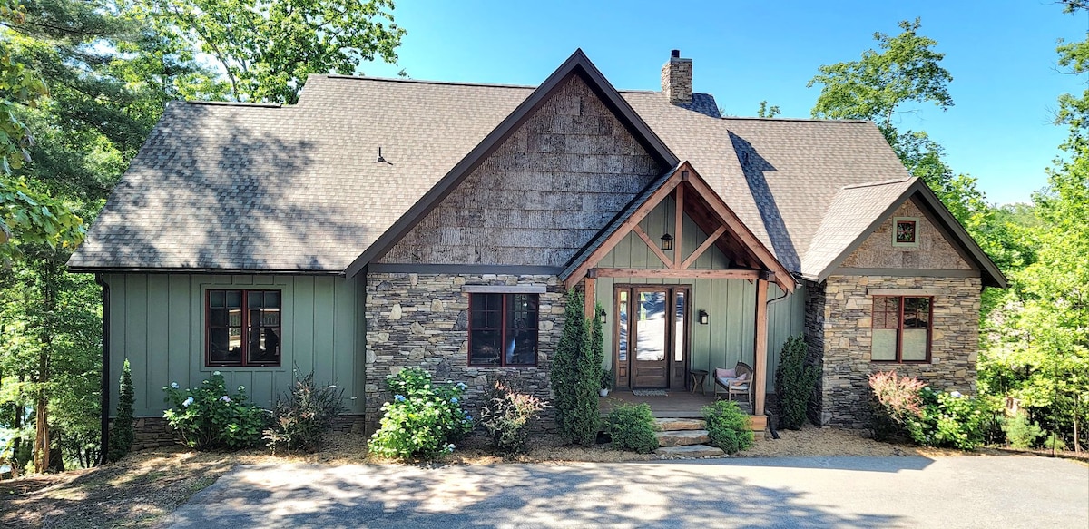 Wake up to Blue Ridge Mountain views from a stunning A-Frame retreat. This is a custom-built 4-bedroom is the most well-equipped vacation rental near Lake James. Spend mornings on the water or golf course, then relax by the fire pit or in the game room with a 70" TV. Enjoy a full gym, bunk room, and spacious kitchen. 14 mins to Marion Lake Club Golf Course, 5 mins to Bear Creek Marina, 10 mins to Lake James State Park. Perfect for families and group getaways.
