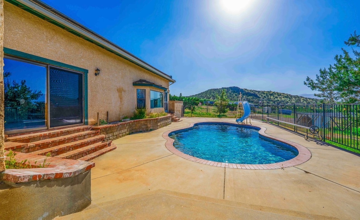Spacious 3-Bedroom Retreat with Pool. This beautifully appointed rental features 3 bedrooms, 2 remodeled bathrooms, and a backyard oasis with a private pool, spa, and hot tub. The outdoor kitchen includes a gas grill, and a Blackstone griddle. Relax in the covered living space with ceiling fans, a sound system, and a 70” TV. Inside, enjoy plush theater seating, a 75” TV with surround sound, and seamless backyard access. Just 10 minutes from Palmdale, this is the perfect getaway!