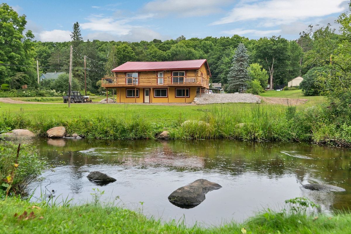 Forget your worries in this spacious in town cabin, a river that runs through the backyard. Plenty of room for a large gathering. Access to ATV/Snowmobile trails from the yard. Near great fishing spots, hiking, tennis, and a playground for little ones. Minutes from the Potawatomi Casino. Sleeps up to 12 guests with 4 bedrooms plus a loft with a bed and pullout couch in the living room . There are 2.5 baths, a large kitchen and dining table. Pool table, dart board and smart TV's in all rooms.