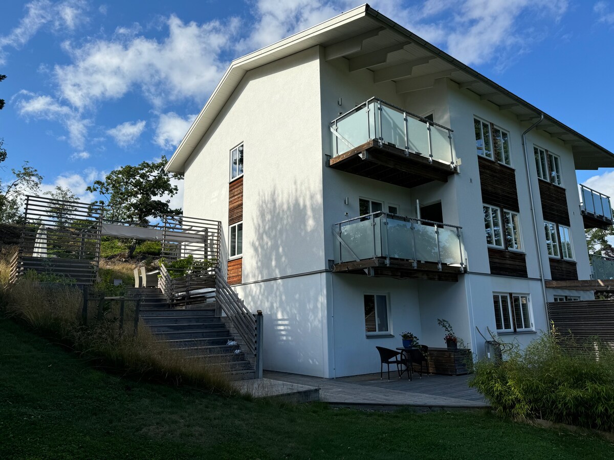 Hjärtligt välkommen till vår mysiga lägenhet i ett lugnt område nära Stockholm. På gångavstånd finns både sjö och hav, fin natur, en bra restaurang (The Old Smokehouse) och en matbutik. Bra kommunikationer till Stockholm. Busshållplatsen ligger i slutet av gatan och det tar 20–30 min att ta sig till och från Slussen. Vi är en svensk-fransk familj som även pratar tyska och engelska. På förfrågan finns även möjlighet att beställa frukost och att hyra cykel.