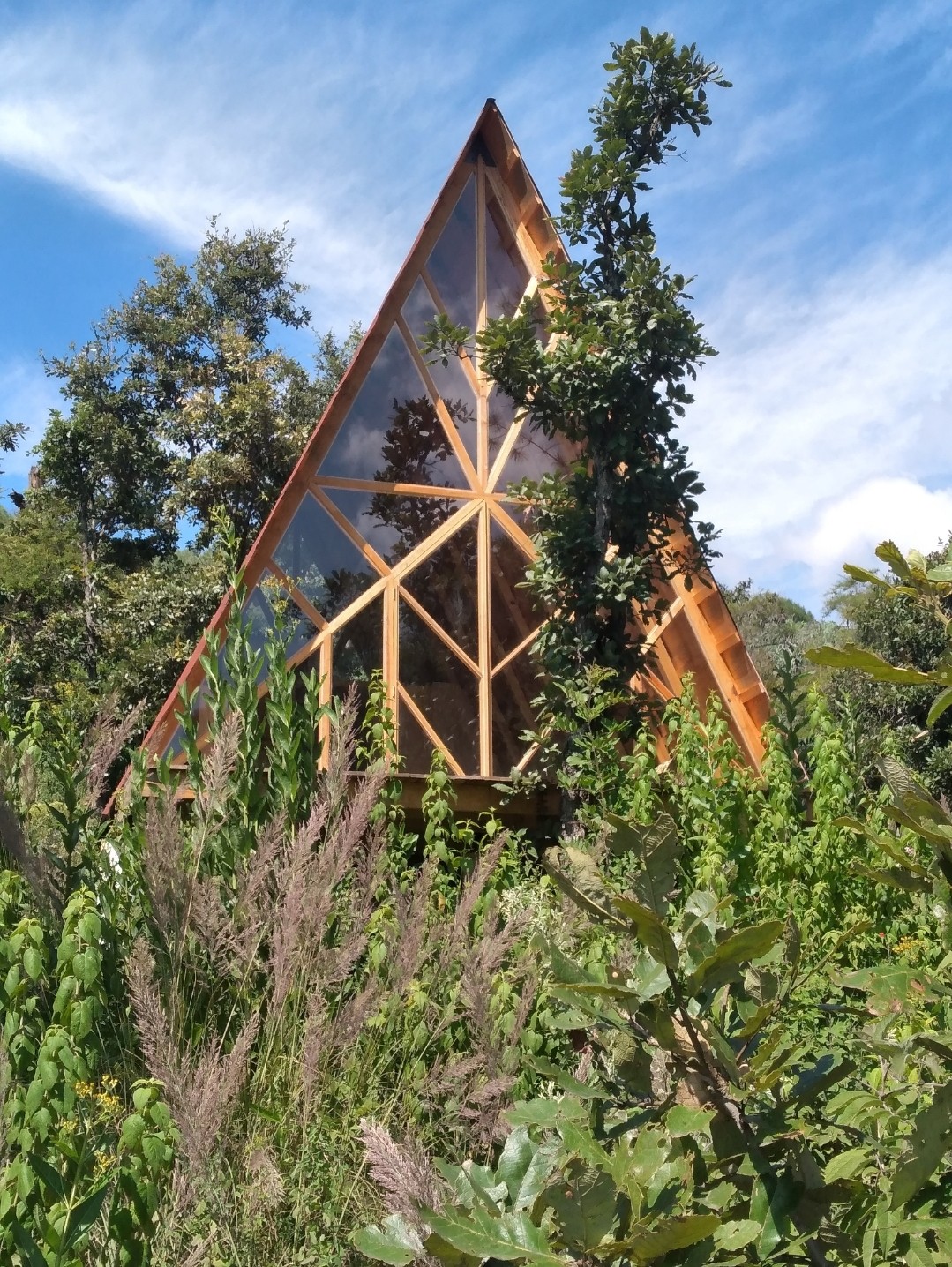 Cabaña de madera tipo A en la colina, con espectacular vista al lago, las montañas y al valle. Un espacio tranquilo de descanso donde relajarse al calor de una fogata, con vista al lago. Cuenta con otras áreas exteriores para explorar. Deck con vista al lago y jacuzzi que puede reservarse para uso exclusivo ( con costo por calefacción).