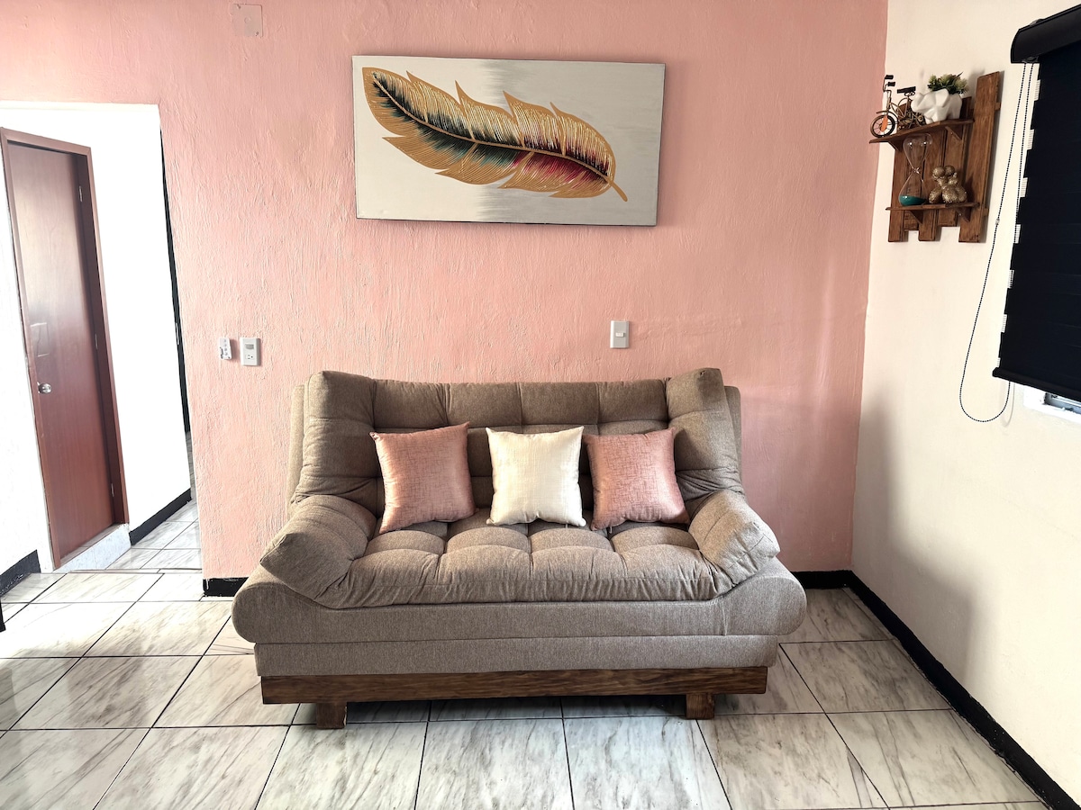 Disfruta de la sencillez de este alojamiento tranquilo y cerca del aeropuerto internacional de Guadalajara (5 minutos)en auto limpieza y sin problemas de horario para la recepción de huespedes. internet, Netflix,prime video cuenta con dos recámaras cada una con su baño y las camas son Queen size cada una y los servicios necesarios para cocinar.