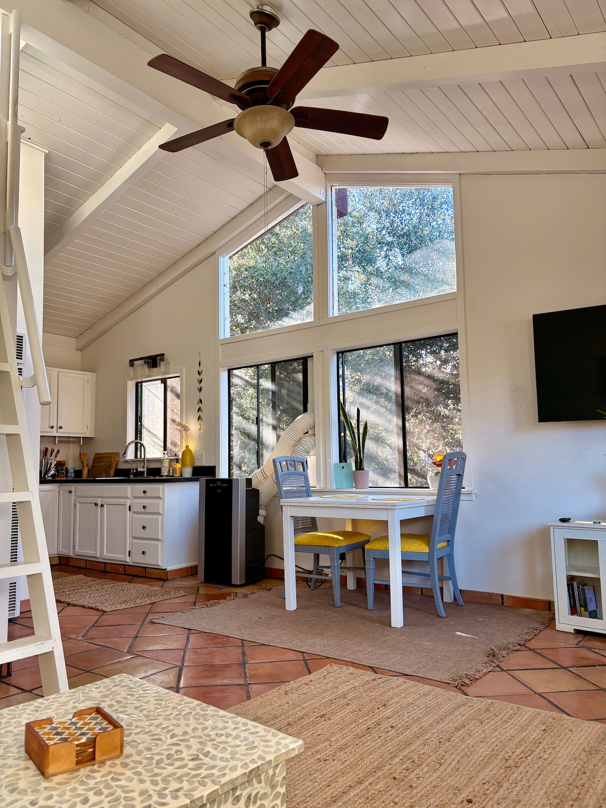 Manzaradan en iyi şekilde yararlanmak için tasarlanmış 70 'lerden ilham alan bu 2 katlı alanda zamanda geriye gidin. Özenle toplanan nostaljik parçalar sayısız bitki, bol miktarda kitap ve bir pikapla harmanlanıyor. Pencerelerden bol miktarda vahşi yaşamı izleyin. NOT: Yaban hayatı, atlar, köpekler ve çok çeşitli bitkilerle çevrili bir bölgede yaşıyoruz (semtimizin adı Fernwood, çünkü okyanus deniz katmanından en yeşil ve yemyeşil). Bu nedenle, alerjiniz veya astımınız varsa burası sizin için en iyi yer olmayabilir. Ayrıca, yalnızca önceden onaylanırsa bazen köpeklere de izin veriyoruz. Üst kattaki alan aydınlık ve havadardır ve her şey manzarayla ilgilidir! Mutfak, 2. el ve yeni mutfak aletlerinin bir karışımıyla doludur. Ev yapımı yemeklerinizi göstermek için mükemmel olan güzel ahşap kaseler ve seramikler toplamayı seviyorum. Mutfağı zeytinyağı, balzamik sirke, deniz tuzu, sarımsak, hardal, ketçap, soya sosu ve daha fazlası gibi bazı temel malzemelerle dolu tutmaya çalışıyoruz. Bu şekilde mağazadan bu kadar çok eşya almak için stres yapmak zorunda kalmazsınız. Banyo küçük ve minimaldir, ancak ihtiyacınız olan her şeye sahiptir. Ayrıca plaj havlularının bulunduğu bir sepet de ekledim. Alt katta ahşap tavanları ve büyük bir dolabı olan açık bir yatak odasına gidin. Yatak yepyeni bir Tuft & Needle King. Biraz iş yapmanız gerekiyorsa bir masa vardır. Oda kapalı bir yarı özel açık alana açılır. Yolun karşısındaki ana evde yaşıyoruz, bu nedenle mahremiyet bölümünden bizi görebilirsiniz. Bahçedeki otları veya sebzeleri paylaşmaktan her zaman memnuniyet duyarım. Mekân boyunca beton zeminler ve birçok doğal ahşap unsur vardır. Her odada her şeyi rahat tutmak için bir duvar ısıtıcısı vardır. Evimiz 60 'larda inşa edildi ve 70' lerde/80 'lerde "Barış Çiftliği" adlı bir hippi komünü burada yaşarken çok güncellendi. Bir sürü tuhaflığı var ama bu yüzden Topanga'yı seviyoruz :) Verandanızın diğer tarafında iki bahçe yatağı bulunan avlumuz bulunmaktadır. Bunlara göz atıp biraz bitki toplamaktan çekinmeyin. Bahçemizde sık sık rakunlar, vaşaklar, sincaplar ve hatta ara sıra bir yılan görüyoruz, bu nedenle her zaman nerede yürüdüğünüze dikkat edin. Özel girişiniz garaj yolundaki park yerinizin hemen yanındadır, bu nedenle bizimle hiç karşılaşmama ihtimaliniz vardır. Çok çalışıyoruz ve her zaman dışarıdayız, ancak misafirlerle tanışmayı seviyoruz, böylece tanışmak ve bazı yerel ipuçları almak isterseniz müsait olabiliriz. İsterseniz mesafemizi de koruyabiliriz;) Dost canlısı komşular ve köpeklerle tanışmak için birkaç dakika uzaklıktaki gizli patikada yürüyün. Hafif okyanus esintisi, yerel halkın bu bölgeye "iklim açısından mükemmel Fernwood" dediği anlamına geliyor. Buradan Topanga'nın batı tarafında, plaja 15 dakikadan kısa mesafededir. Kanyonun tepelik kısmındayız, bu da en iyi manzaranın yanı sıra dar dik yollar anlamına geliyor. Yavaşlayın ve doğanın seslerinin tadını çıkarın! Bu semt, alerjiler için ideal olmayan yemyeşil manzarası nedeniyle Fernwood olarak biliniyor. Los Angeles'ta bir arabanızın olması en iyisidir çünkü çok yayılmıştır. Evimizden küçük kasabamız Topanga'ya yürüyebilirsiniz, ancak yokuş aşağı yaklaşık 2 mildir ve sonra geri yürümeniz gerekir! Başardık ve fena değil. Bizden sadece birkaç adım ötede harika yürüyüş parkurları da var. Kasabamızda dağ bisikleti kiralayabileceğiniz harika bir bisiklet dükkanı bulacaksınız ve size nereye gideceğiniz konusunda tonlarca bilgi verecekler. Uber ve Lyft istendiğinde buraya gelir, ancak bazen biraz sabır gerektirir. Topanga Bulvarı'nda tonlarca ücretsiz sokak otoparkı bulunan yerel plajımıza arabayla yaklaşık 10 -15 dakika mesafedeyiz (ücretsiz park bölgesinde olduğunuzdan emin olmak için tabelalara bakın). Evimize ilk geldiğinizde, yolun rüzgarlı kıvrımlarından biraz korkmuş olabilirsiniz! Sonsuza dek sürecekmiş gibi gelebilir, ama aslında ana bulvardan evimize sadece 1 mil uzaklıktadır. Yavaş sürün ve manzaraları izleyin... güzel kaya oluşumları, dere kenarında şarkı söyleyen kurbağalar ve ilginç evler! Yeni insanlar ziyaret ettiğinde çok heyecanlanan iki küçük kurtarma köpeğimiz var, bu yüzden köpekleri sevmiyorsanız, bu en iyi seçenek olmayabilir;) Onları yanımızda her yere götürüyoruz, bu nedenle huzurlu inzivanızı mahveden geveze köpekler olmayacak. Ayrıca, atların bitişiğinde yaşıyoruz, bu nedenle gece gündüz bazı ilginç sesler olabilir. Küçük çıkmaz sokağımızda otopark çok sınırlıdır, bu nedenle lütfen garaj yolumuzdaki belirlenmiş yere park ettiğinizden emin olun. Siz gelmeden önce size talimatlar göndereceğim. Sigara içiyorsanız lütfen verandadaki özel kül tablasını kullanın. Yangın bölgesindeyiz, bu yüzden çalıların yanında sigara içmeyin. İçeride sigara içerseniz depozitonuzdan 200 $ tutarında bir ücret almam gerekecek. Herkes yangınlar konusunda çok endişelendiği için kanyonda sigara içmek oldukça hoş karşılanmıyor, bu yüzden parıltıları önleyebilmeniz için bir elektronik sigara kalemi getirmenizi öneririm;) Kanyonda cep telefonu çekmiyor, bu nedenle lütfen wifi ağımıza bağlanana kadar herhangi bir hizmet almamaya hazır olun. Elektrik ve internet kesintileri, yolların kapanması, tahliyeler, örümcekler ve daha fazlasına hazırlıklı olun! Şehirde değilsiniz ve burada işler çığırından çıkabilir;) Çoğu Airbnb'de olduğu gibi, rızamız olmadan kayıtlı olmayan misafirlerin mekâna girmesine izin vermiyoruz, bu nedenle lütfen ziyaretçilerin gelmesini isteyip istemediğinizi bize sorun. Eminim konaklayabiliriz! Gece konaklayan misafirler için bu stüdyo için en fazla 3 kişi vardır. Mutfağı tüm