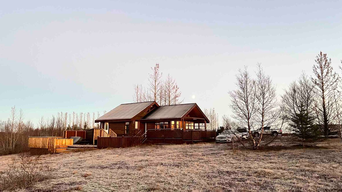 Brún, nehir ve dağ manzaralı lüks, modern bir evdir. Altın Çember'deki Laugarás'ta (Geysir, Gullfoss, Laugarás Lagünü, Skálholt, Þingvellir Milli Parkı) bulunan 4 konforlu yatak odası, 2 tam banyosu, büyük jakuzisi ile 12 kişiyi ağırlayabilir. Anahtar kelimeler: muhteşem manzaralar, modern, büyük jakuzi, kraterler, Laugarás Lagünü'ne 10 dakika yürüme mesafesinde, buz mağarası, buzullar, göl, Hvítá Nehri kıyısında.