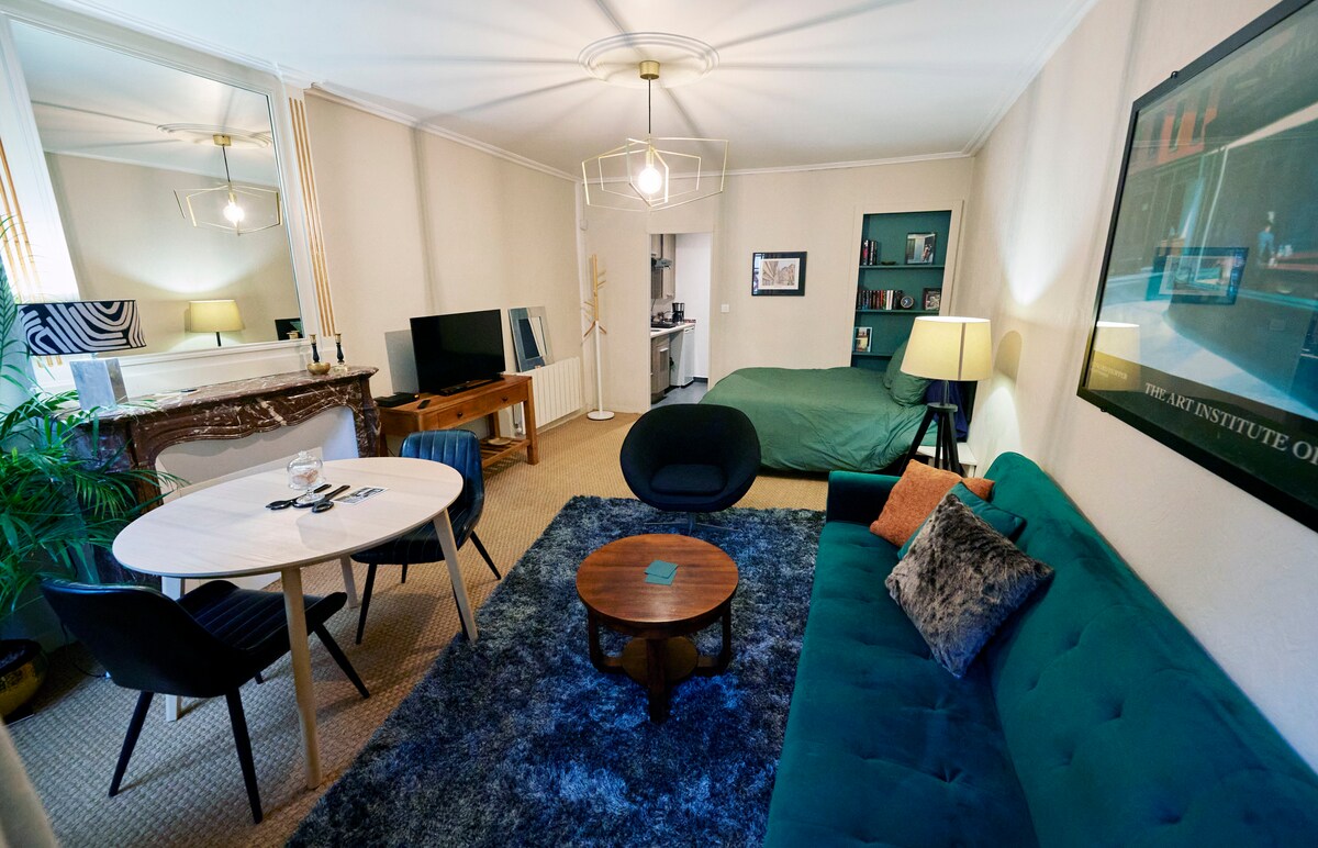 Quimper'in tarihi merkezinin kalbinde, Kéréon sokağı ve renkli ahşap evleri. Katedralin dibinde, ikinci katta, olağanüstü konumda bir stüdyo. Dışarıdaki fotoğraflarda kırmızı/pembe pencereli bina. Wifi ve bağlı TV, fiber kutusu. Çarşaf, havlu, nevresim takımı ve yatak örtüsü temin edilir, yatak siz gelmeden önce yapılır. Turistik mobilyalı 2 yıldızlı konut.