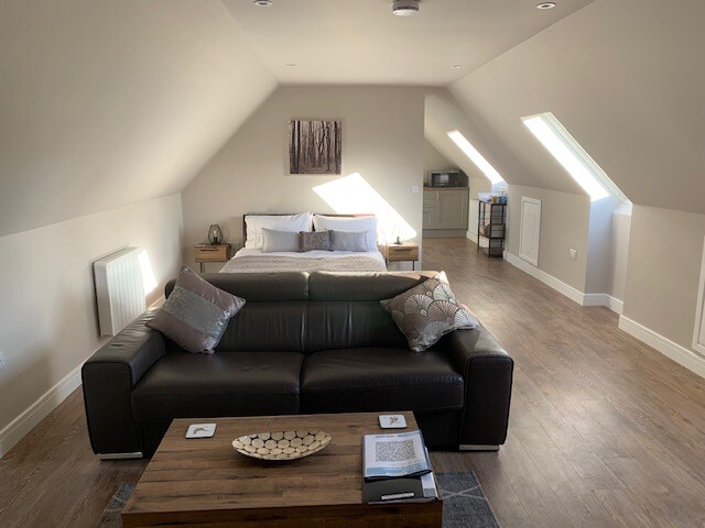 Çiftlik tarlaları ve Lincoln Katedrali'ne uzanan manzaralı, bağımsız, huzurlu çatı katı stüdyosu. Özel merdivenlerle erişim. Araç park yeri. Woodhall Spa'nın iç kesimlerindeki tatil köyüne 5 dakika mesafede. Oturma alanına ve kırsal kesime bakan güzel manzaralara sahip özel meşe balkon. Otel tasarımlı çift kişilik büyük boy yatak (ikiz yataklara bölünebilir) (ortopedik şilte). Sadece çay, kahve ve tost yapma olanakları (çay/kahve/tahıl/yulaf lapası/atıştırmalıklar ve süt dahil). Buzdolabı. Ebeveyn duş odası. Masa ve sandalye. Televizyon ve radyo.
