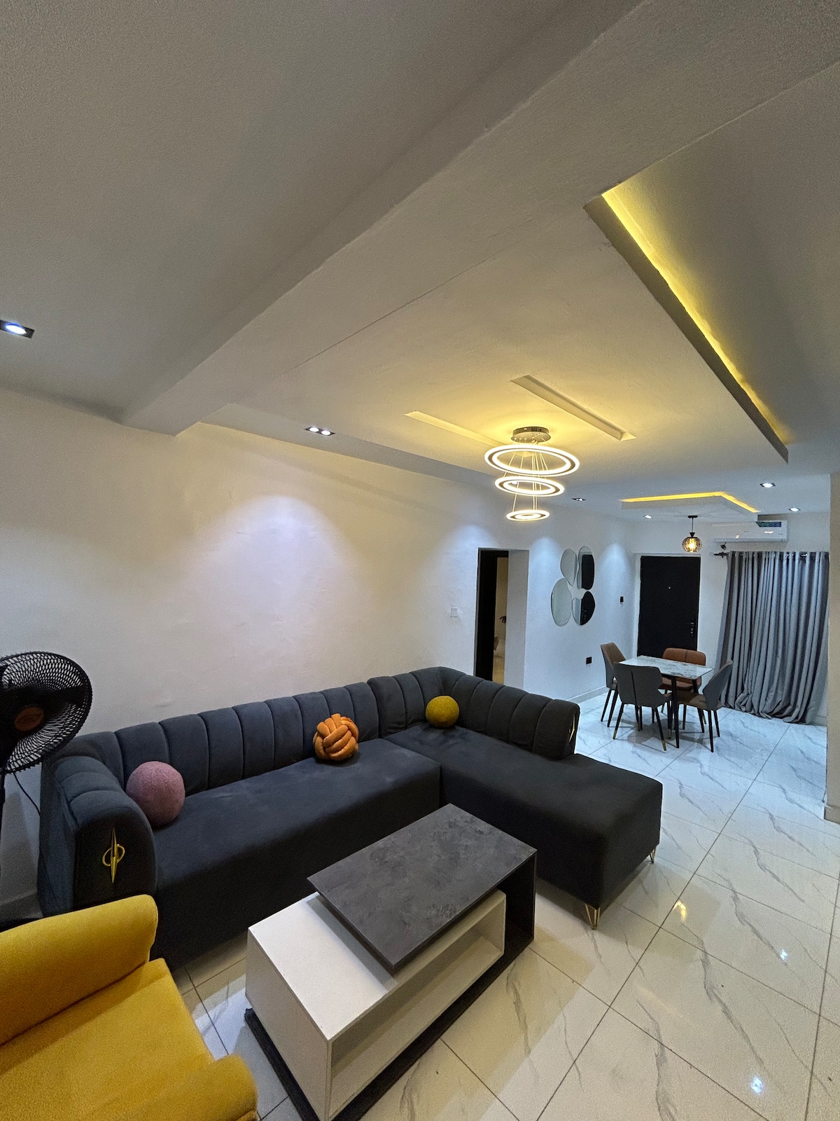 Kick back and relax in this calm, stylish 2 bedroom apartment with quality amenities like: Swimming Pool Gym Elevator Top floor beautiful view PS5 3 Balconies En-suite rooms Fully Equipped Kitchen Washing Machine NETFLIX 24/7 Power supply Clean Water Parking space Wi-Fi House Keeping Gated and secured Estate