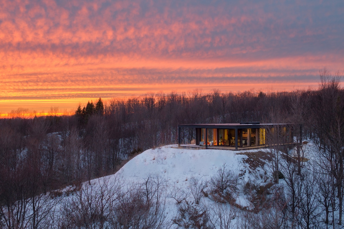 Seeblick Haus is a small vacation home for 4 people on a secluded, very private site in Northport. The open floor plan of the house is designed around the natural setting of the property and facilitates a 270 degree view of Grand Traverse bay and the surrounding orchards. Large windows offer the experience to be close to nature through all seasons and the wrap-around porch extends the living space to the outdoors.