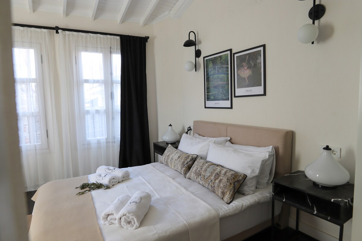 Authentic 102-year-old stone house in Plomari’s old town. Renovated with exposed rock walls, naturally cool, open-plan living/kitchen (fridge, oven, Nespresso), rain-shower bathroom, sofa that becomes a double bed, and mezzanine bedroom with hotel linens. AC, 400 Mbps Wi-Fi. Just 5 min to beaches and seconds to nature, mountains, and trails. Close to squares, ouzo distilleries, and tavernas—a romantic Lesvos gem. Perfect for couples or small families.