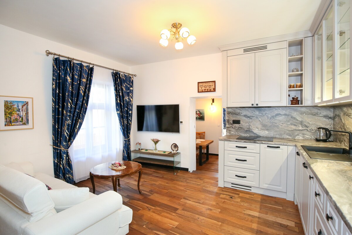 Güneşli daire, samimi bir atmosferde arkadaş toplantıları için mükemmeldir. Antik Banska Stiavnica'nın tam merkezinde, yenilenmiş güzel bir ortaçağ binasında (14. yüzyıl) 3. katta yer almaktadır. Erb Brewery ve Cafe Weird Mistress'in yakın semtinde, Aşk Bankası'nın altında kısa bir yürüyüş mesafesinde. Güneşli tarafa, sessiz bir Silver Street'e bakıyor. Daire iki odalı geniş ve cömerttir (65 m2), yatak odası bölümleri yüksektir, onlara ulaşmak için merdivenler vardır. Tam donanımlı bir mutfak, kablosuz internet bağlantısı vardır.