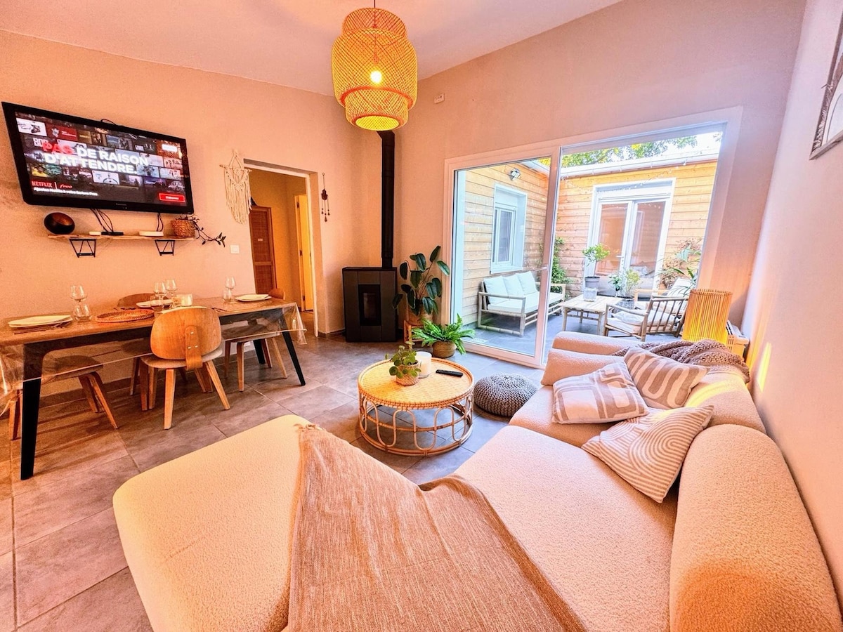 "Teras", ağaçlı bahçeye bakan güneye bakmaktadır. Şunlardan oluşmaktadır: - 90 genişliğinde ve 200 uzunluğunda 2 yataklı, kepenkli pencereli, bağlı TV ile donatılmış bir oda. - bir çekyat Bu odayı şilte üzerinde 180 cm genişliğinde bir yatak yapma imkanı. - Duş, havlu kurutucu, saç kurutucu bulunan bir banyo - fırın, mikrodalga fırın, buzdolabı bulunan bir mutfak alanı. - 4K TV - Klima Çarşaf ve havlu seçeneği bir gece için 10 €