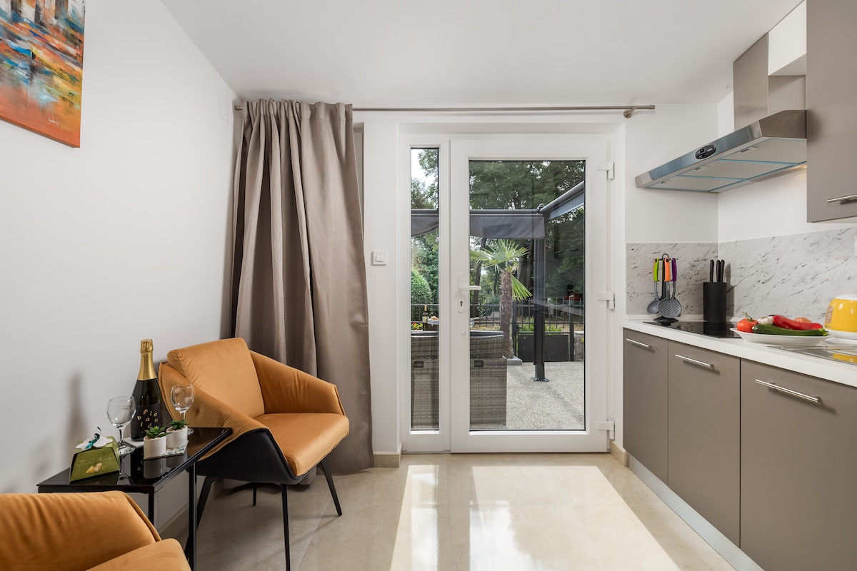 Daire Opatija şehir merkezine yakın, arabayla sadece birkaç dakika uzaklıkta veya sekiz dakika yürüme mesafesinde yer almaktadır. Oturma odası, yatak odası, yemek odası, iki banyo, mutfak, sauna, açık alan salonu, teras, çevredeki bahçe ve otoparktan oluşmaktadır. Çevredeki bir bahçeye sahip zemin katta olmanız sayesinde bir daire değil, bir ev kiralama hissine sahipsiniz.
