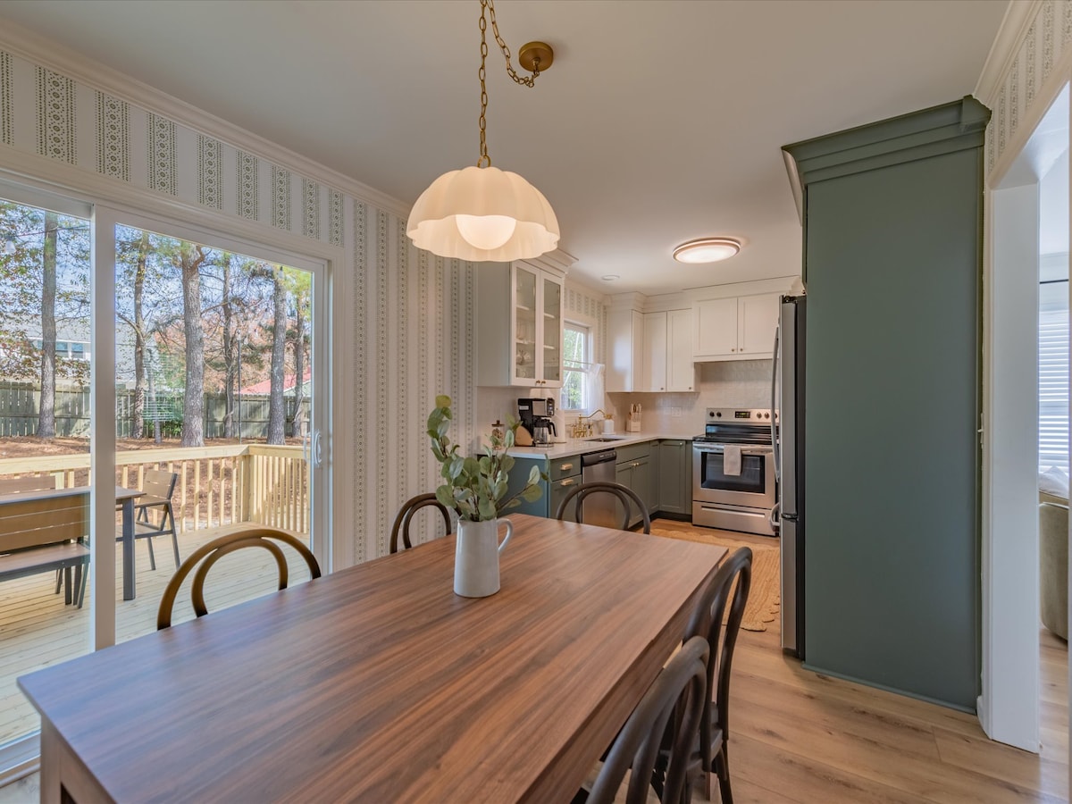 The Bull's Retreat, a newly renovated space with 2 King Beds and 2 single beds, ideal for travelers or getaways. It's centrally located in a peaceful neighborhood near Ft. Bragg, Fayetteville, Sanford & Southern Pines. It's great for reconnecting with familiy and friends. The open-concept living space includes a fully equipped kitchen, breakfast bar, dining area, 3 bedrooms, 2 bathrooms, and open living room. Note: Owners reserve the garage for personal use only; it isn't accessable to guests.