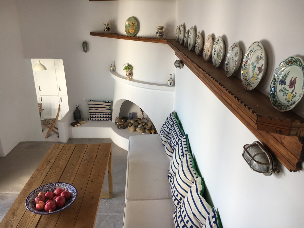 Güzel Magazia plajına ve sonsuz maviye bakan Chora kayalıklarına tünemiş ev, gerçek bir saklanma yeri ama aynı zamanda adayı deneyimlemek için ideal bir üs. Ege ışığı, deniz esintisi, ufukta yükselirken güneşin büyüklüğü, gün batımındaki huzurlu renkler, hepsi gökyüzü ve deniz arasında unutulmaz bir deneyim vaat ediyor. İhtiyacınız olan her şey yürüme mesafesinde. Mavi II ile birlikte, ev 2 -4 kişiyi daha barındırabilir.