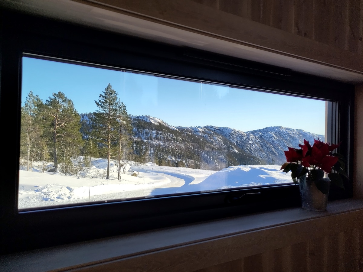 Hytte fra 2021. Fantastisk utsikt som tas med inn i hytta via vinduer fra gulv til tak. Du får derfor naturen tett på. På sommeren beiter sauene rundt hytten og hare kan du ofte se tidlig på morgenen. Varmepumpe og peis som gir en god varme i hytten. Egen loftstue hvor døren kan lukkes. Supert for ungene å leke med mye plass på gulvet. Her finner dere TV, lego, puslespill, brettspill. Hytten passer fint for to familier. 10 sengeplasser. Hvis man bare er voksne anbefales Max 8 personer.