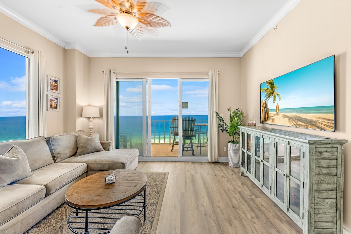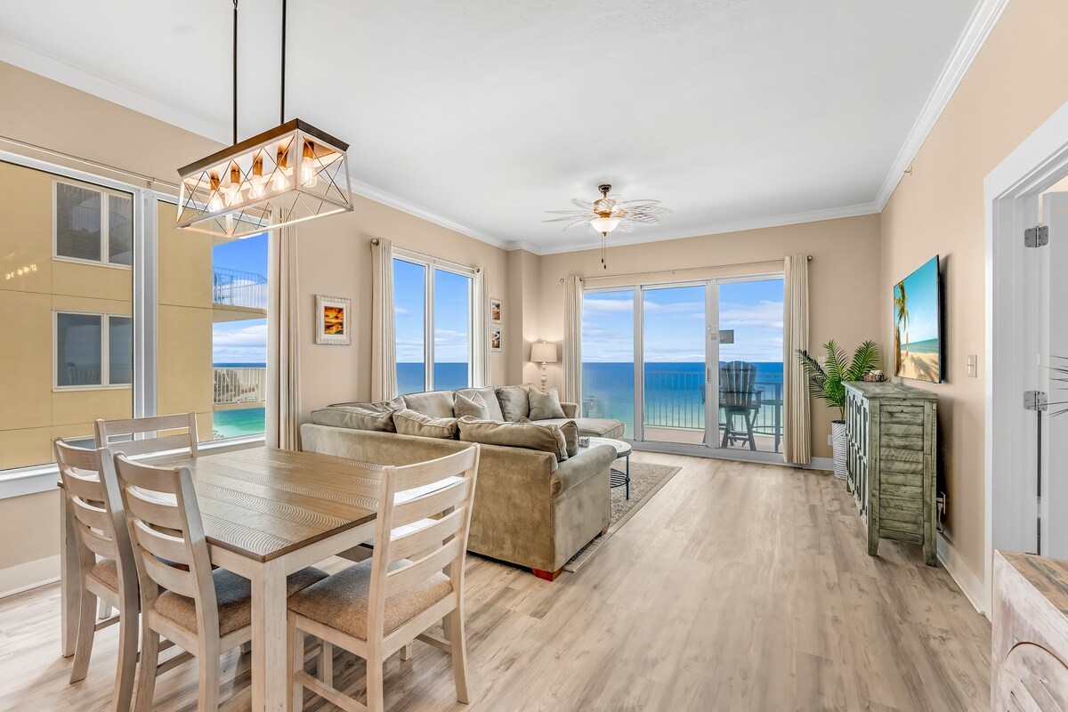 This GULF FRONT BEACH condo has a style all its own. Long Beach is a gated community and features the longest stretch of sand in PCB. This newly renovated condominium on the 7th floor has panoramic views of the Gulf from every room . Spanish-style ceramic tile floors & premium granite countertops throughout. The huge curved balcony attracts spectacular sunsets. The resort has low occupancy so the super-fast elevators won't leave you waiting. The resort has a 25 yo age minimum in order to book.