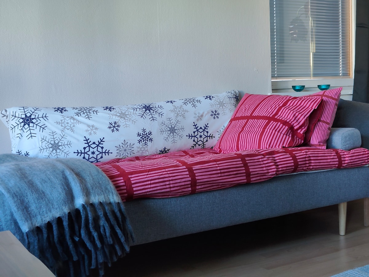 Yenilenmiş (Mutfağın resimleri güncellendi), Rovaniemi'nin merkezine 5 km mesafede, huzurlu bir semtte ferah ve rahat bir daire. Dairede rahat bir queen boy yatağı olan bir yatak odası, tam mutfaklı ve çekyatlı geniş bir yaşam alanı ve çatı katı alanı vardır. Aynı binada yaşadığımız için bize kolayca ulaşabilirsiniz ve her konuda yardımcı olmaktan memnuniyet duyarız. Bölge sessiz ve doğaya yakın, yakınlarda güzel bir göl var. Misafirlerimiz için iki bisikletimiz var.