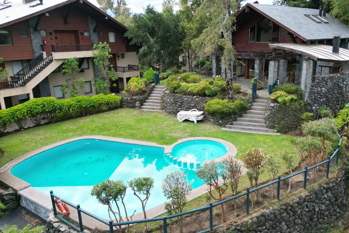 Güzel yeşil alanlara sahip bir yerde, yanardağa giden yolda, gökyüzünün merkezine ve Centro de Pucon'a yakın bir yerde dinlenin. Tam donanımlı daire, king yataklı 1 yatak odası. 2 çocuk için çekyatlı oturma odası, ısıtma, kablosuz internet bağlantısı, TV, otopark, teras ve havuz. Kulüp evi : Çocuklar için elektronik oyunlar Spor salonu, bisikletler (ücretsiz). tinajas, quincho (ekstra ücret). Çamaşırhane (çamaşır ve kurutma makinesi) ek ücret (500 peso bozuk para). 7/24 kapıcı