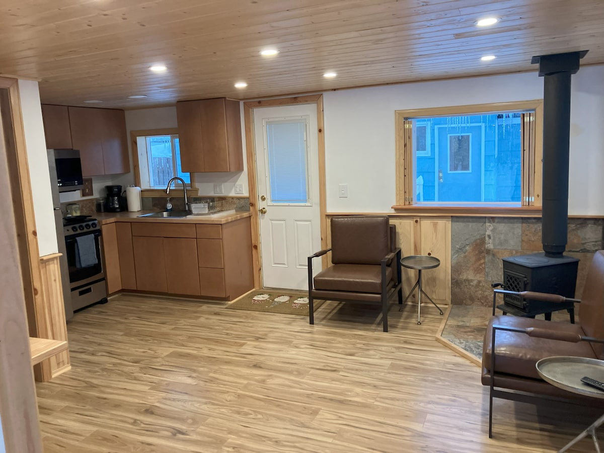 Bu tamamen yenilenmiş çiftlik tarzı misafir evi Seward'ın tadını çıkarmak için mükemmel bir tatil yeridir. Alaska. Misafirhanede ahşap zeminler ve boyunca çam tavanları bulunmaktadır. Yatak odanızda kraliçe yatak ve açık duşlu ekli bir banyo vardır. Ana odada odun sobası, televizyon, kablosuz internet bağlantısı ve yeni cihazlara sahip bir mutfak bulunmaktadır. Yeşil kuşak ve Two Lakes Park'ın yanında bulunmaktadır. Limana sadece 5 blok mesafededir.