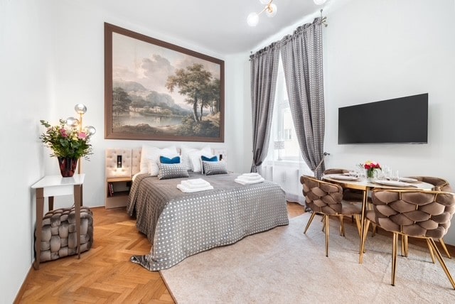 Apartament Gold zauroczy Państwa nowoczesnym designem. Özenle seçilmiş ekstralar ve olanaklar sizi evinizdeymiş gibi rahat hissettirecektir. Daire, TV ve internete ücretsiz erişimi olan üst düzey TV ve ev aletleri ile tam donanımlıdır.