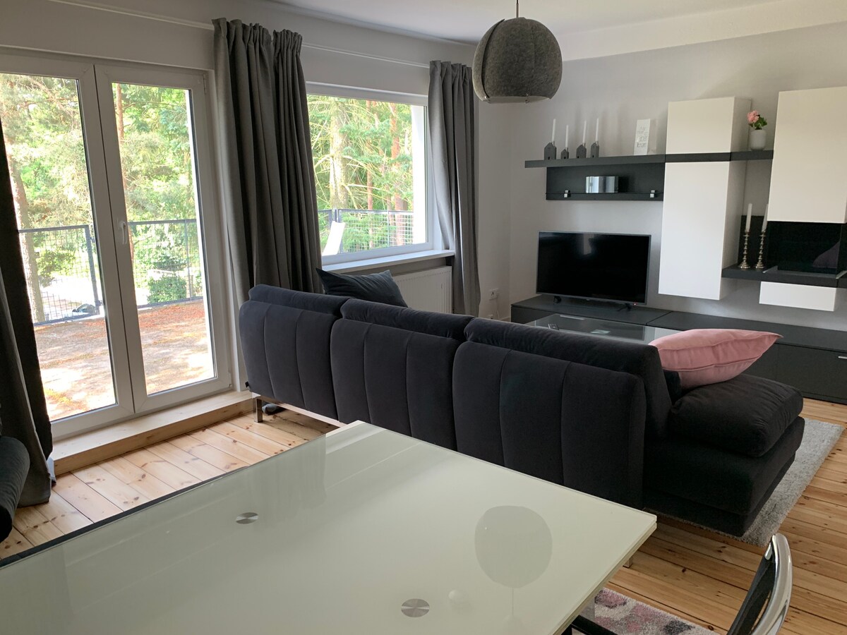 Özel teras ile zevkli bir şekilde döşenmiş yepyeni tek yatak odalı daire. Olanaklara ve toplu taşıma yakın. Berlin ve Potsdam arasında ideal bir konumdadır. Büyük çift kişilik yataklı yatak odası, rahat yatak, geniş gardırop alanı ve özel tenha terasınıza erişim. Başka bir çift kişilik yatak, TV ve DVD oynatıcının yanı sıra dört kişilik yemek alanına dönüştürülen rahat L şeklinde kanepeye sahip oturma odası. Açık planlı mutfak, buzdolabı/dondurucu, ocak, fırın ve bulaşık makinesi ile iyi donanımlıdır.