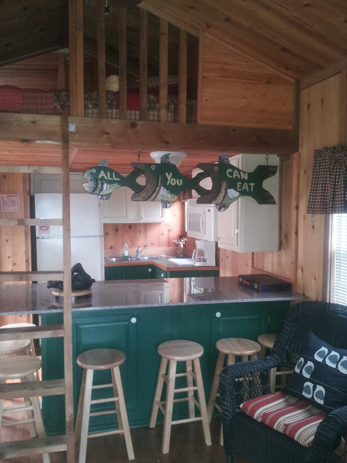 Tiny home located on the edge of woods around a well stocked 24 acre fishing lake. This unit has a full size kitchen, small living room, a master bedroom with king size bed and bathroom with shower on the first floor. 2 queen size beds are located upstairs in the half-loft with a sliding door room divider between. The screened-in porch is a great place to relax and enjoy the ample wildlife. Surrounded by small communities. Plenty of places to explore and restaurants to try.