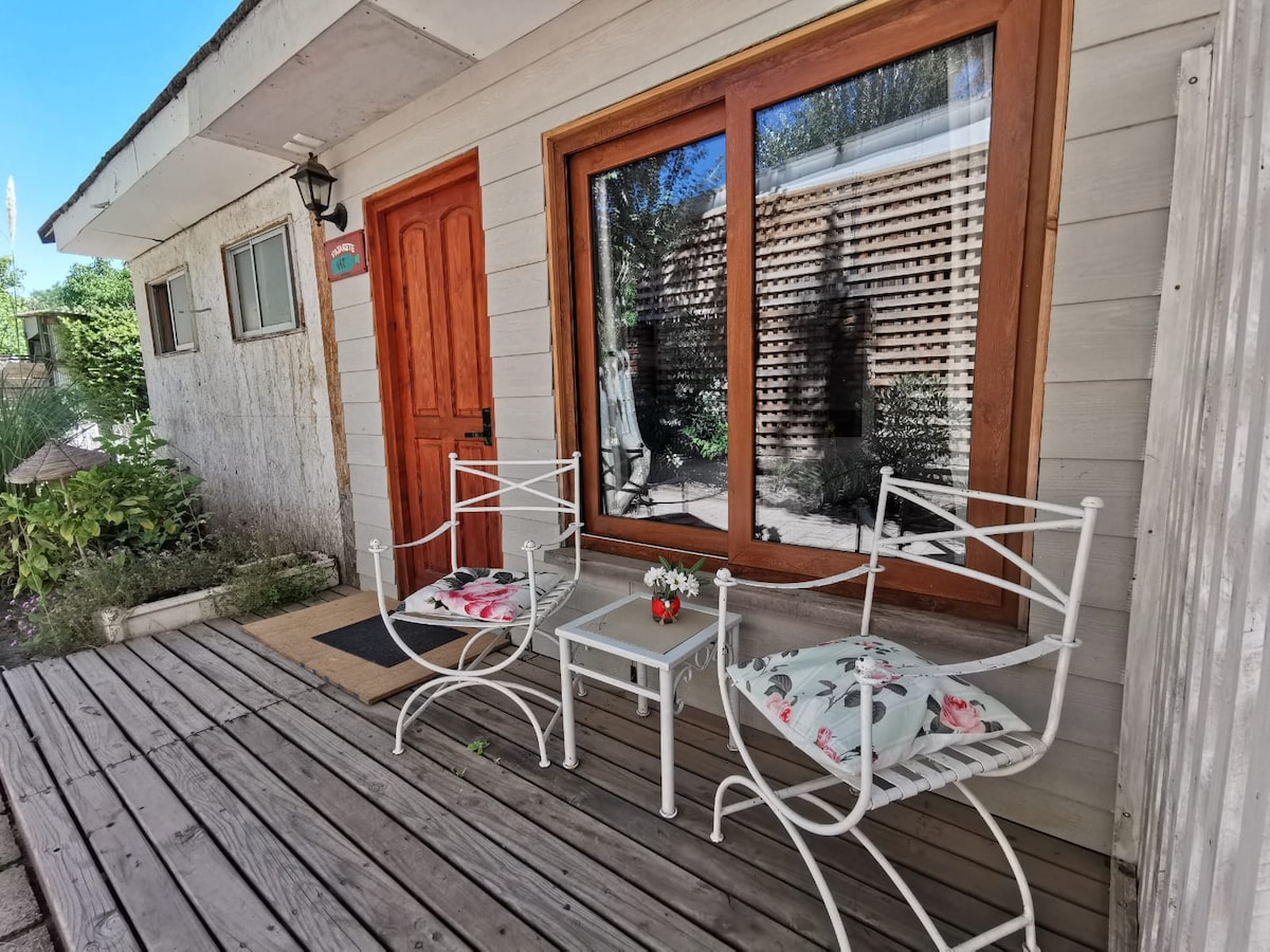 Escape to Tranquility in Our Cabin with Private Hot Tub in Pirque We invite you to discover tranquility at a cabin near Santiago. Located in Pirque, home to Chile's most iconic vineyards and just minutes away from the majestic Río Clarillo National Park, our cabin offers a modern retreat where relaxation takes the spotlight. Enjoy the privacy of your own oasis with a hot tub equipped with hydrotherapy. The cabin is designed to blend modern comfort with the natural charm of Pirque.