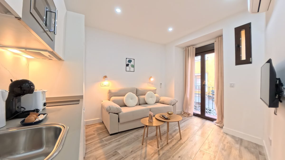 Tamamen dışarıda ve çok aydınlık olan daire, Plaza'nın girişlerinden birinin hemen önünde, Calle Mayor'da bulunmaktadır. Mobilya ve ev aletleri. Şunlardan oluşur: Yatak odası, mutfak, oturma odası tek bir odaya entegre edilmiş, klima ve ısıtma ve ayrı banyo. Mutfak tam donanımlıdır. Yaşam alanı 140 cm'lik bir çekyat, TV, iPod ve dekoratif şömineden oluşmaktadır. Sonra 1,90x90'lık 2 yatak ve bir dolaptan oluşan yatak odası alanı geliyor.