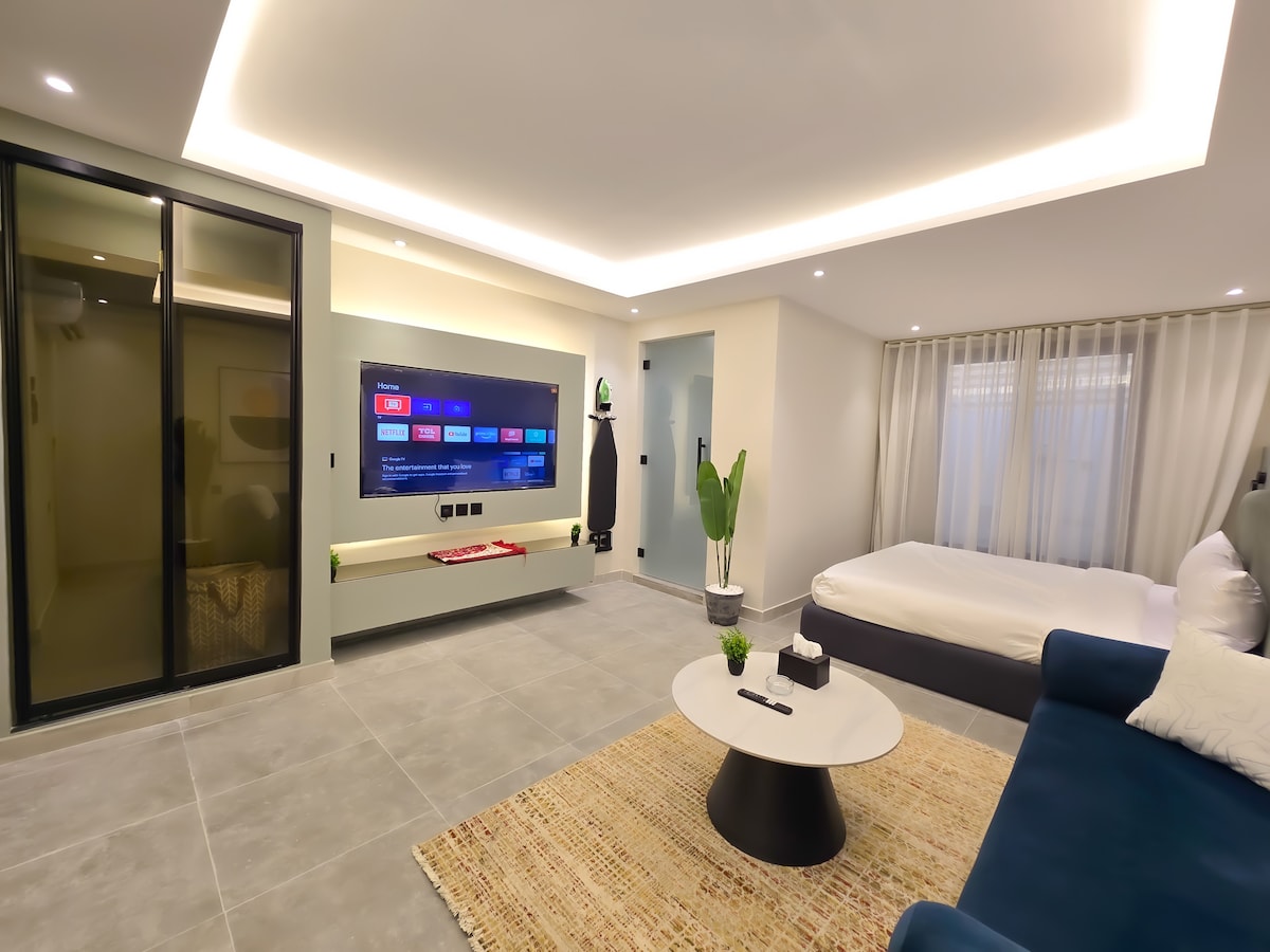 Beklentilerinizi aşan olağanüstü bir konaklama sunan dairemize hoş geldiniz. Daire, en iyi kaliteli yataklarla donatılmış bir yatak odasının yanı sıra keyif almak için 65 inç akıllı ekran (Netflix, Shahid, BeIN) + Wi-Fi ile konforlu kanepelere sahip ayrı bir salona sahiptir. Mutfak, tüm ihtiyaçlarınızı karşılamak için tam donanımlıdır. Aile ve arkadaşlarla etkinlikler ve toplantılar için uygun, kırsal tasarıma ve finans merkezine özel bir manzaraya sahip bir dış oturma alanı mevcuttur. Daire, kısa ve uzun süreli konaklamalar için donatılmıştır. Şehrin merkezinde, turistik yerlere, hizmetlere ve restoranlara yakın harika bir konumdadır.