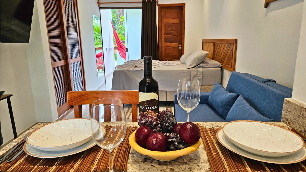 Private 420 ft² apartment in Vila Real with a private balcony and Mexico-inspired décor. Quiet location surrounded by nature, just 900 meters from the city center. Includes Wi-Fi, Netflix, air conditioning, garage, and shared access to a terrace with swimming pool and sea view. Full kitchen, stylish living room with HD TV, luxurious double bed, comfortable double sofa bed, and spacious bathroom with excellent shower. Parking available on the property. Follow: @vilareal_itacare