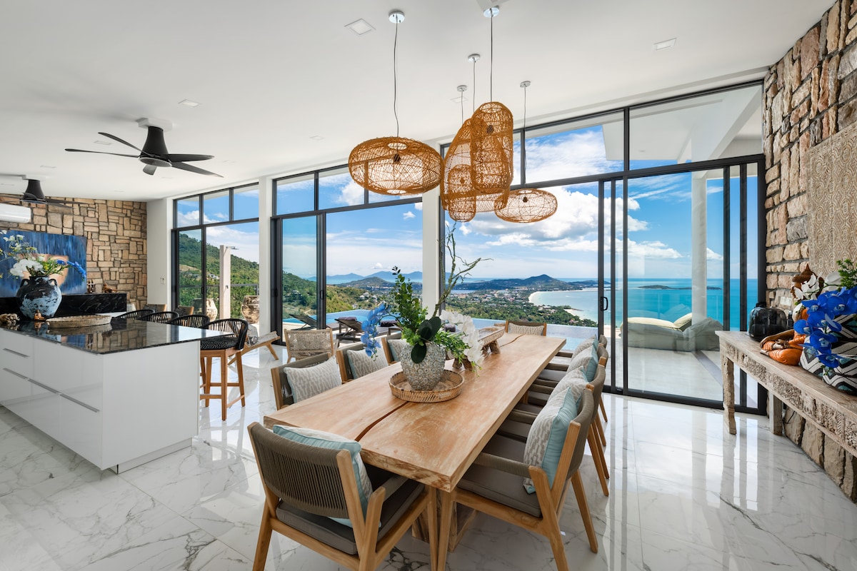 Chaweng tepelerinde 180° deniz manzaralı, 620 m² özel lüks villa → Günlük kahvaltı ve temizlik → 25 m yüksekliğinde sonsuzluk havuzu. → Spor salonu, bilardo, dart ve masa tenisi 7/24 tesisteki personelle→ konukseverlik (İngilizce, Tayca) → Beton yumurta kabuklu küvet → Her yatak odasında özel banyo Netflix'li→ yüksek hızlı internet ve kablosuz → internet bağlantısı, akıllı TV. → Bose ses sistemi → Ücretsiz kahve ve içme suyu → Su ve elektrik dahildir Plajlara arabayla→ 10 m. İstek üzerine→ daha fazla hizmet sunulur
