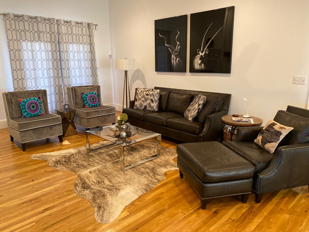 Modern new house just four blocks North of the Courthouse. Two story house with one King bedroom and bath downstairs and the upstairs has an additional king bedroom/bath and Loft with sitting area and twin bed overlooking living area. Full kitchen, washer and dryer perfect for short or long stays. Enjoy our open living/dining/kitchen in front of the beautiful gas fireplace. Wifi and satellite TV located in all sleeping areas and in the living room. Perfect house for upto 5 adults NO Children!