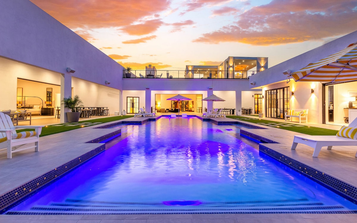Welcome to Scottsdale Modern Villa! Vacation in style at this custom-built 5BR/4.5BA luxury estate, offering over 4,000 sq. ft. of modern design and resort-style amenities. Set on a spacious half-acre lot, this single-level home is perfect for families, group getaways, golf trips, and more. With soaring ceilings, open-concept living spaces, and an entertainer’s dream backyard, you’ll enjoy all the luxuries of a 5-star resort with the privacy and comfort of home. Sleeps 14