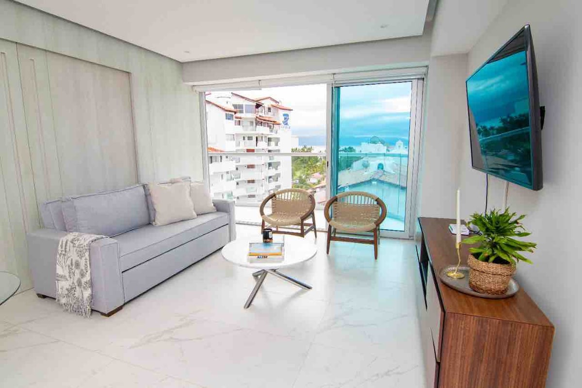Nautico Marina Vallarta'da daire, 8. katta inanılmaz manzara, kral yataklı bir yatak odası, kral yataklı kanepe, tam banyo, çamaşır odası, kablolu TV, yüksek hızlı wifi, çalışma alanı, binanın çatısında panoramik havuz, ayrıca ortak alanlarda spor salonu, buhar ve sauna, her şey yürüyüş mesafesinde, restoranlar, barlar, süpermarket, güzellik salonu, spa vb. eşsiz konum, yeni daire, Marinadaki en iyi gelişme.