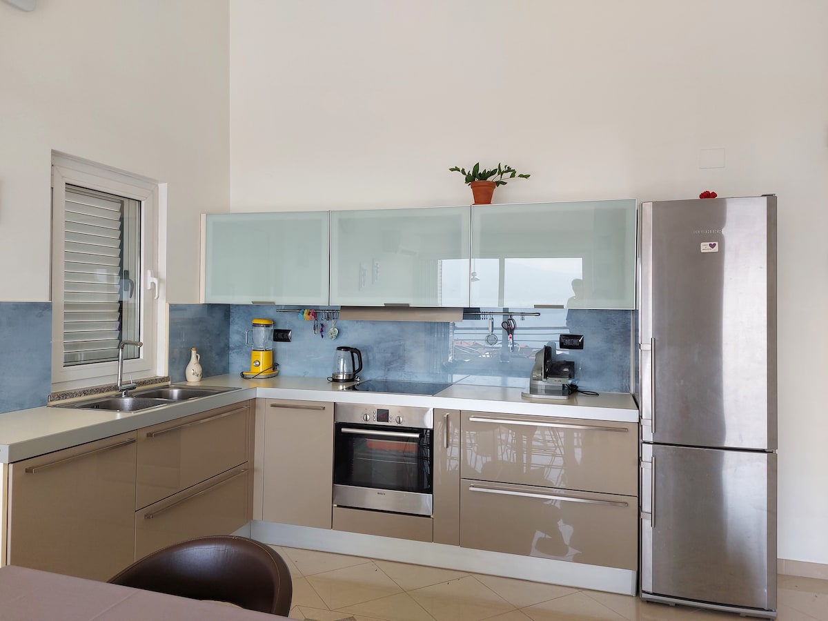 Adriyatik Körfezi'nin panoramik manzarasına sahip huzurlu bir doğa ortamında lüks bir daire. Dört misafire kadar tasarlanmış bu modern mekân, huzurlu bir ortamda günlük stresten ve tam bir konfordan kaçmanızı sağlar. 1 numaralı odadaki yataklar ayrılabilir veya bir çift kişilik yatağa itilebilir. Ayrıca, sıcak yaz günlerinde serinlemek için ideal olan ortak bir havuz da bulunmaktadır. Mekânda ayrıca birinci sınıf ekipmanlara sahip modern bir spor salonu da bulunmaktadır. Deniz ve gün batımı manzarasının keyfini çıkarın.