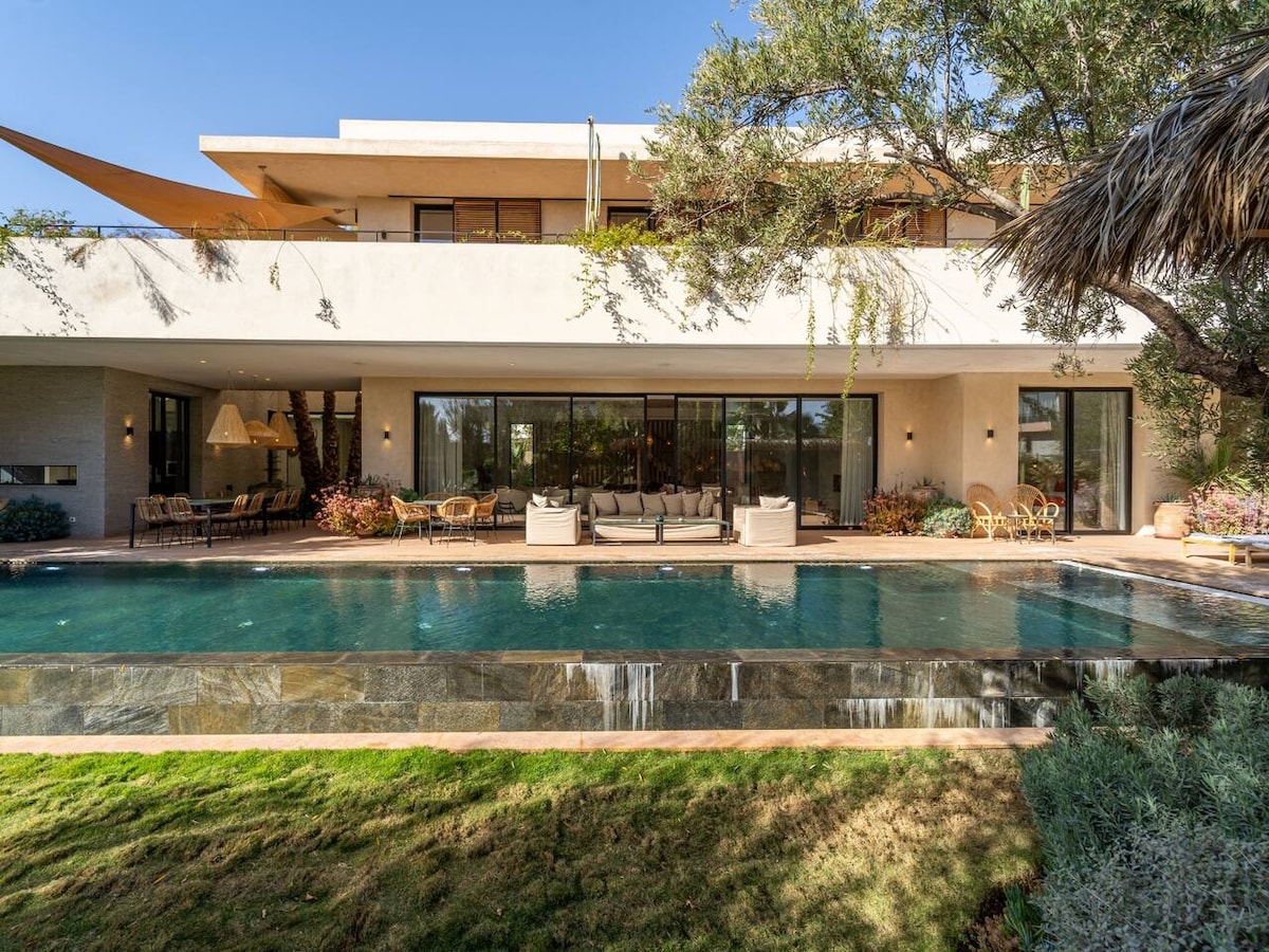 Merkez Marakeş'ten birkaç dakika uzaklıkta, güvenlikli bir golf rezidansında lüks 6 yatak odalı villa. Her odada uluslararası kanalları olan bir TV bulunmaktadır. Özellikler arasında özel sinema, geleneksel hamamlı spa, havuzu ve jakuziyi ısıtma imkanı ve tam donanımlı bir spor salonu bulunmaktadır. Zarafet ve konforu harmanlayan zarif dekorasyonu ile bu villa, şık ve dinlendirici bir Marakeş deneyimi arayan aileler veya gruplar için mükemmel bir inziva yeridir.