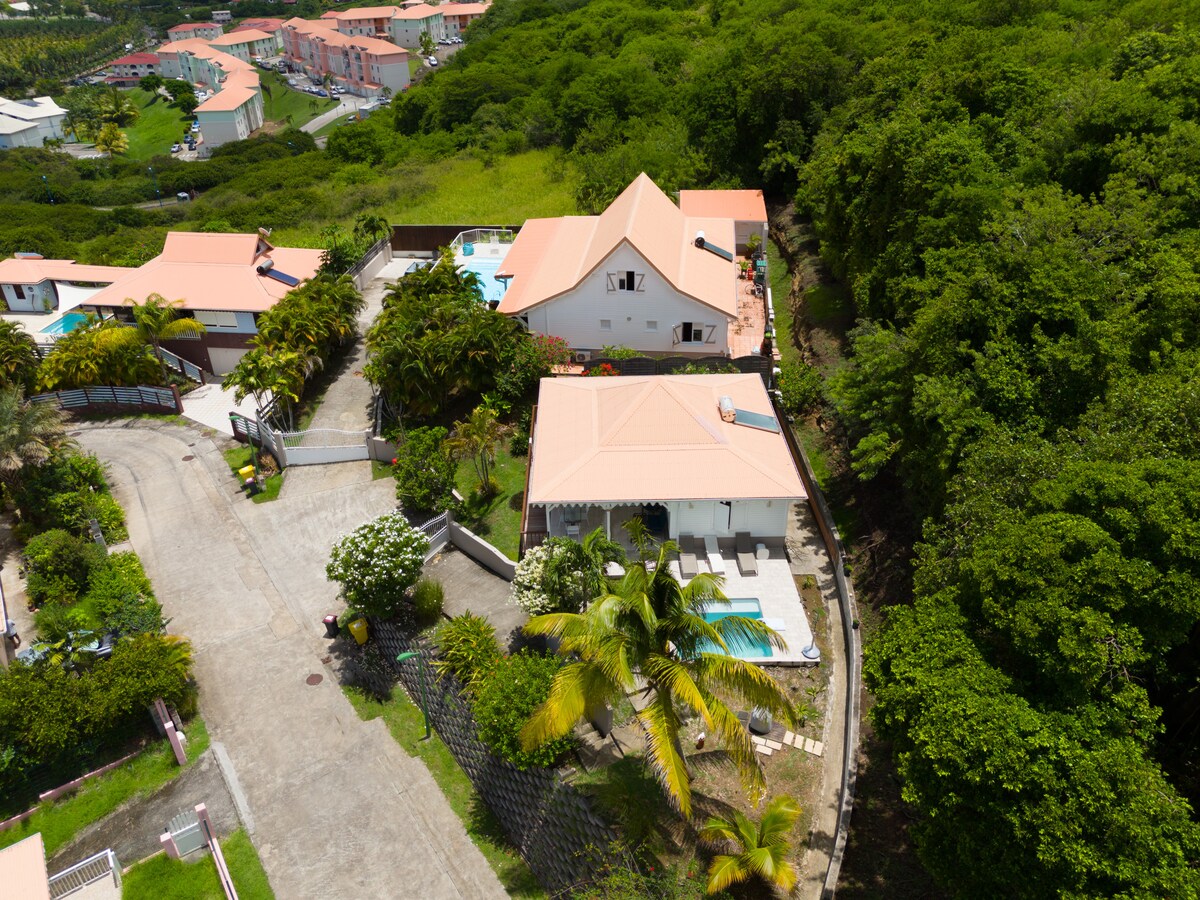 Plaja (2 dakika yürüme mesafesinde) hakim, yeşillik içinde, kolay erişilebilir, karo havuzlu (nehri yansıtan) ev. Yatakta kum olmadan dalgaların sesi... Rocher du Diamant ve kırsal bölgeye muhteşem manzaralar. Sakin, plaja 50 m, kasabaya birkaç dakika, özel ve güvenli bir aile arazisinde (dijital kodlu kapı). Çok ayrıcalıklı bir ortam! Starlink antenli en iyi Wifi Sade ve doğal dekorasyon, 3 klimalı yatak odası, 3 banyo + oturma odasında 2 kanepe (2 ek yatak). Graco/Bb yatağı