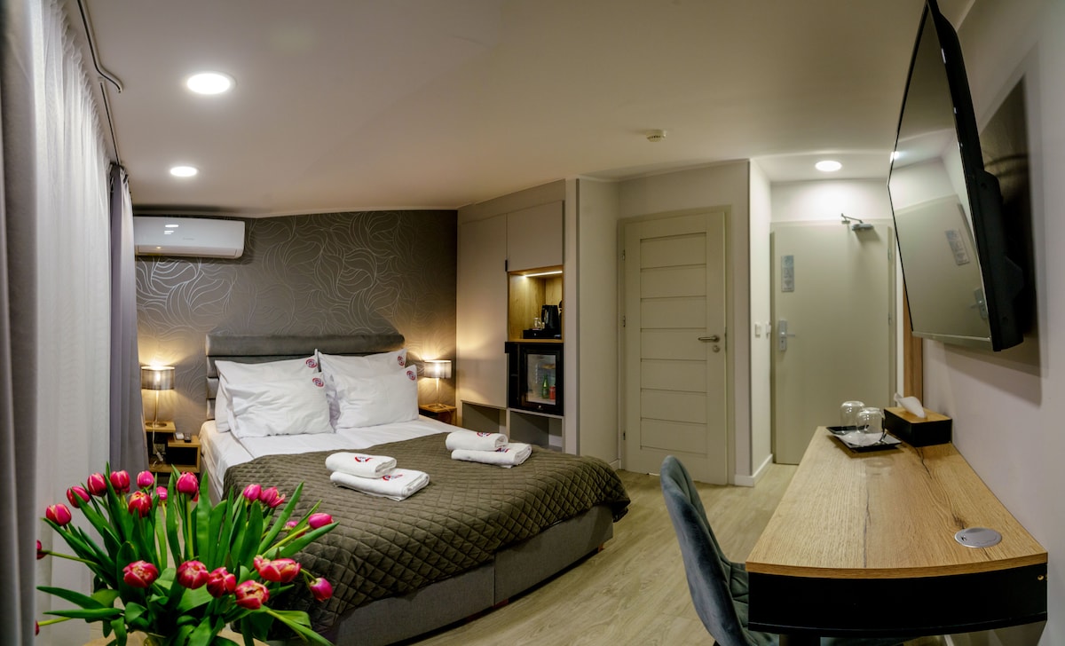 Benzersiz iç mekanlar ve özel bir sürümde dinlenme anı arayan misafirler için tasarlanmış benzersiz bir stüdyo daire. Kalbinde, doğrudan pencerenin yanında yer alan zarif, bağımsız bir jakuzi var; romantik bir akşam için mükemmel. Dairenin içi yüksek tavanlar, dekoratif sıva, sıcak balıksırtı zemin ve atmosferik aydınlatma ile dekore edilmiştir. Yatak odası alanı, açık işli ahşap bir bölme ile zarif bir şekilde ayrılmıştır.
