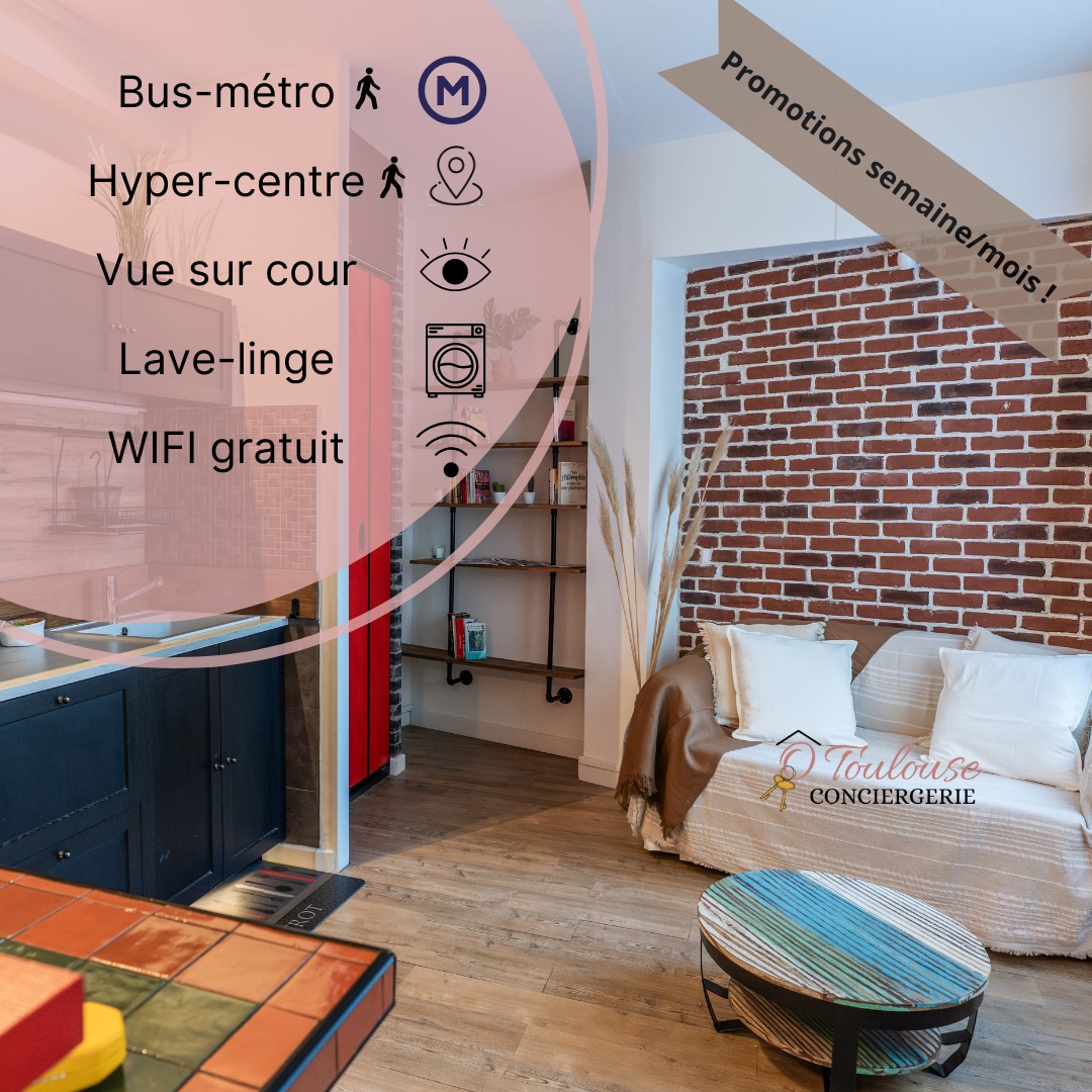 Appartement T2 rénové, il dispose de tout le confort pour un séjour dans Toulouse. Place de parking individuel et fermé sur place : 15€/jour en supplément et sous réserve de disponibilité. Le charme des briques toulousaines se mêle à une décoration moderne, un cadre calme au fond d'une impasse, un espace terrasse extérieure privé et une climatisation réversible pour davantage de confort. Les soirées sont STRICTEMENT interdites. Nous sommes voisins.