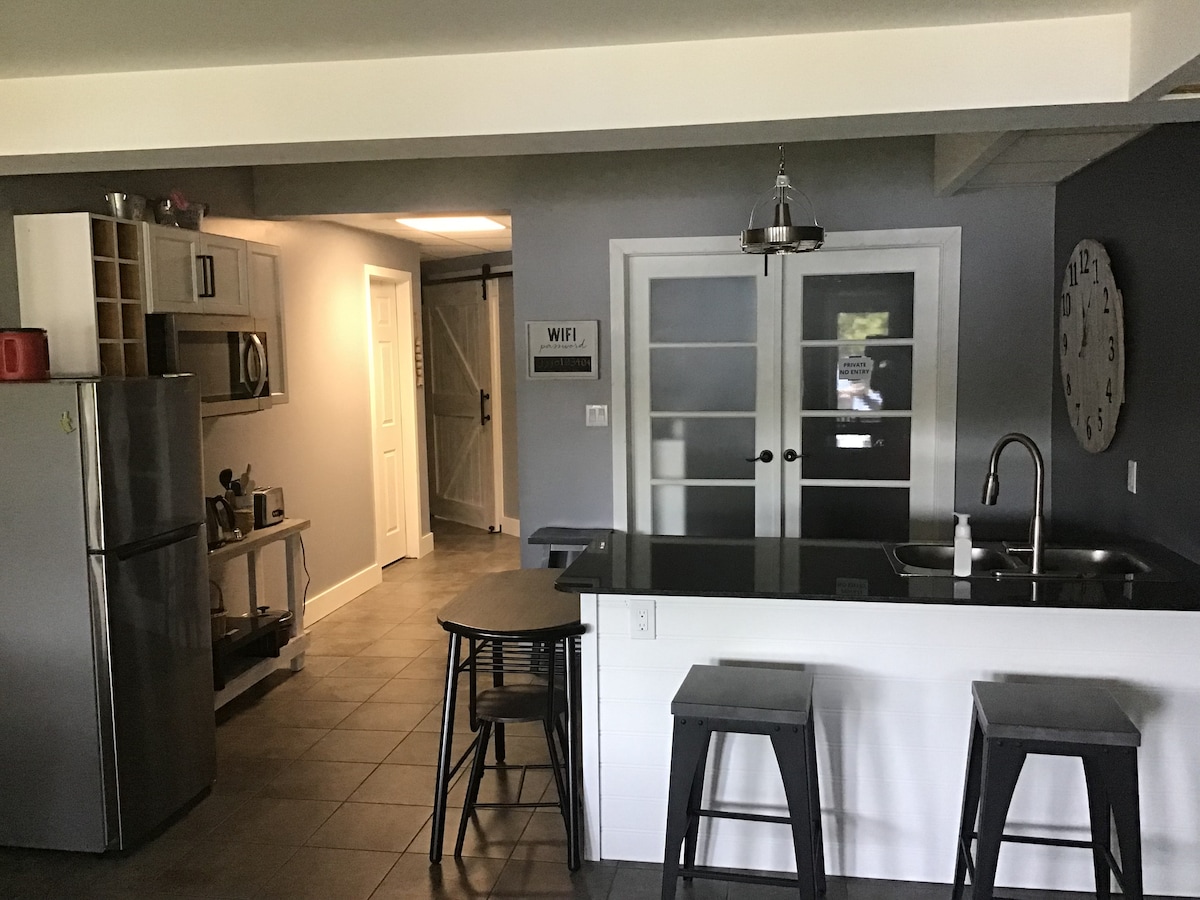 "80 dönümlük özel bir inzivaya🏡 kaçın! Rahat 1 yatak odalı süitte çift kişilik yatak, tam donanımlı mutfak, yüksek hızlı, kablosuz internet bağlantısı, Roku donanımlı TV'ler, gazlı şömine ve duşakabin bulunmaktadır. Güneşli yaşam alanında uzanın veya doğa parkurlarını keşfedin. Sessizlik ve konfor arayan çiftler, yalnız veya uzaktan çalışanlar için mükemmeldir. Sigara içilmez, tamamen mobilyalı, sakin vahşi doğanın ortasında modern olanaklara sahiptir. Murphy yatağı mevcut. Kışın evimizi odunla ısıtıyoruz, bu yüzden havada duman kokusu olacak.