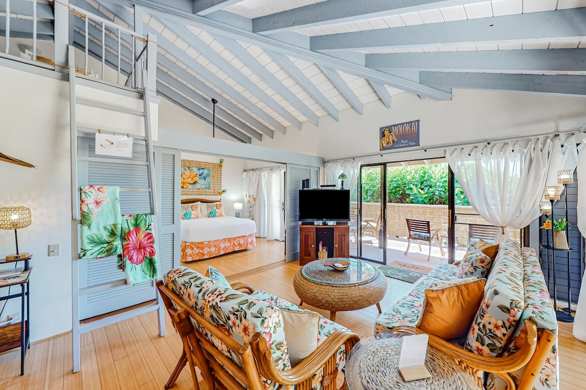 Top floor corner unit at Kepuhi Beach Resort, on the special island of Molokai....in between Maui and Oahu! Vaulted open ceilings, spacious and airy. Completely remodeled and freshly outfitted. Close to beach and ocean-side pool, views of Kaiaka Rock, ocean surf, vivid sunsets. Fully equipped kitchen, luxurious King sized bed. Fast wireless , 40” SmartTV. Perfect setting to unplug, hike or bike the red dirt trails, explore beaches, and experience Molokai fully.