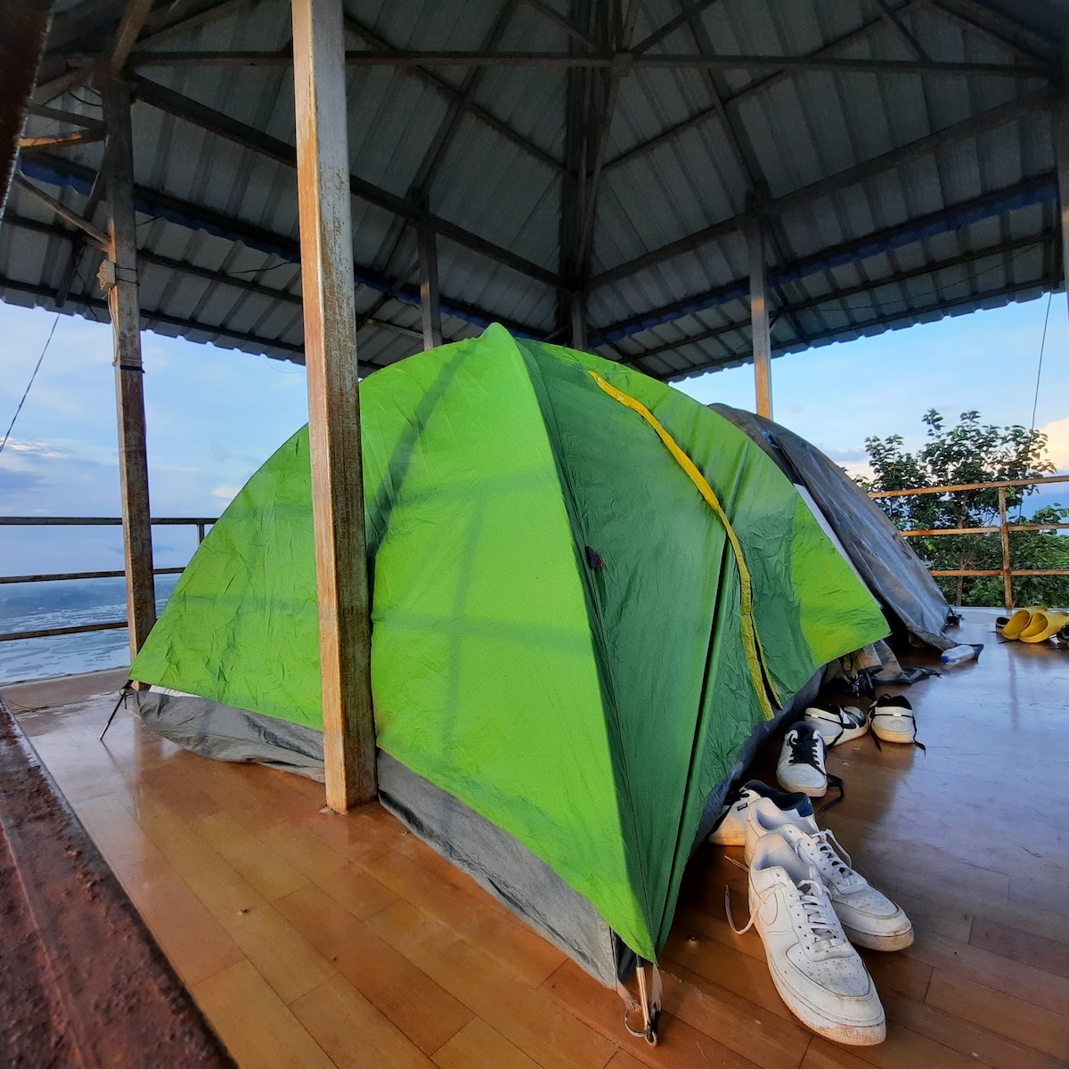 The Traditional Bamboo huts are located inside a complex on the hill side and offer ample light and ventilation & open space. Its a couplet of two huts with an attached bath and ample open area. This hut is one of them. There is a fireplace on one side of the hut. A well arranged clearing where 8-10 people can sit and have fun/cook etc. There's a common shack with an open kitchen for cooking/ BBQ/Bonfire. Toilets are outside. There is running tap water and a pond with Lotus and lilies nearby.