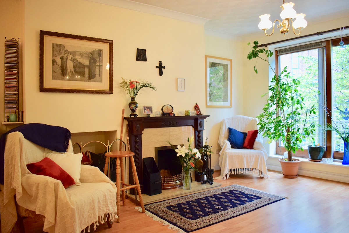 Bu aydınlık ve ferah 1 yatak odalı daire, Portobello Georgian House'un Süper Ev Sahiplerinin alt katında, Dublin'deki çoğu önemli turistik yere yürüme mesafesinde. 3 renkli 1840'lı yıllara ait şömine, konforlu mobilyalar ve güzel bir zeytin ağacı manzarasına sahiptir. Lütfen bu yerin eski ev cazibesinin herkese göre olmadığını unutmayın. Dolap duşu ve yukarıdaki gıcırtılı eski döşeme tahtaları gibi gürültüye duyarlı misafirleri rahatsız edebilecek birkaç tuhaflık vardır.