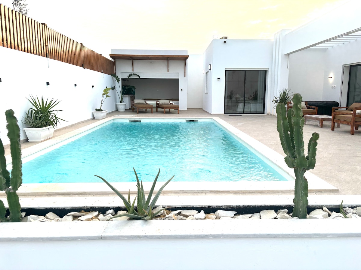 Işıkla dolu, karşıdan bakışları engelleyen lüks bir villa. Djerba Adası'nın yılda 300 gün süren güneşli havalarının keyfini, sahile sadece 10 dakika uzaklıkta bulunan ferah bir evde çıkarın. Tam donanımlı mutfak (Nespresso kahve makinesi dahil). İtalyan duşlu 3 büyük süit. Şelale ve jakuzi ile büyük özel yüzme havuzu, karşıdan bakılamaz. Eko-dostu: Villa, neredeyse sıfır elektrik tüketimi sağlayan güneş panelleri ile donatılmıştır!