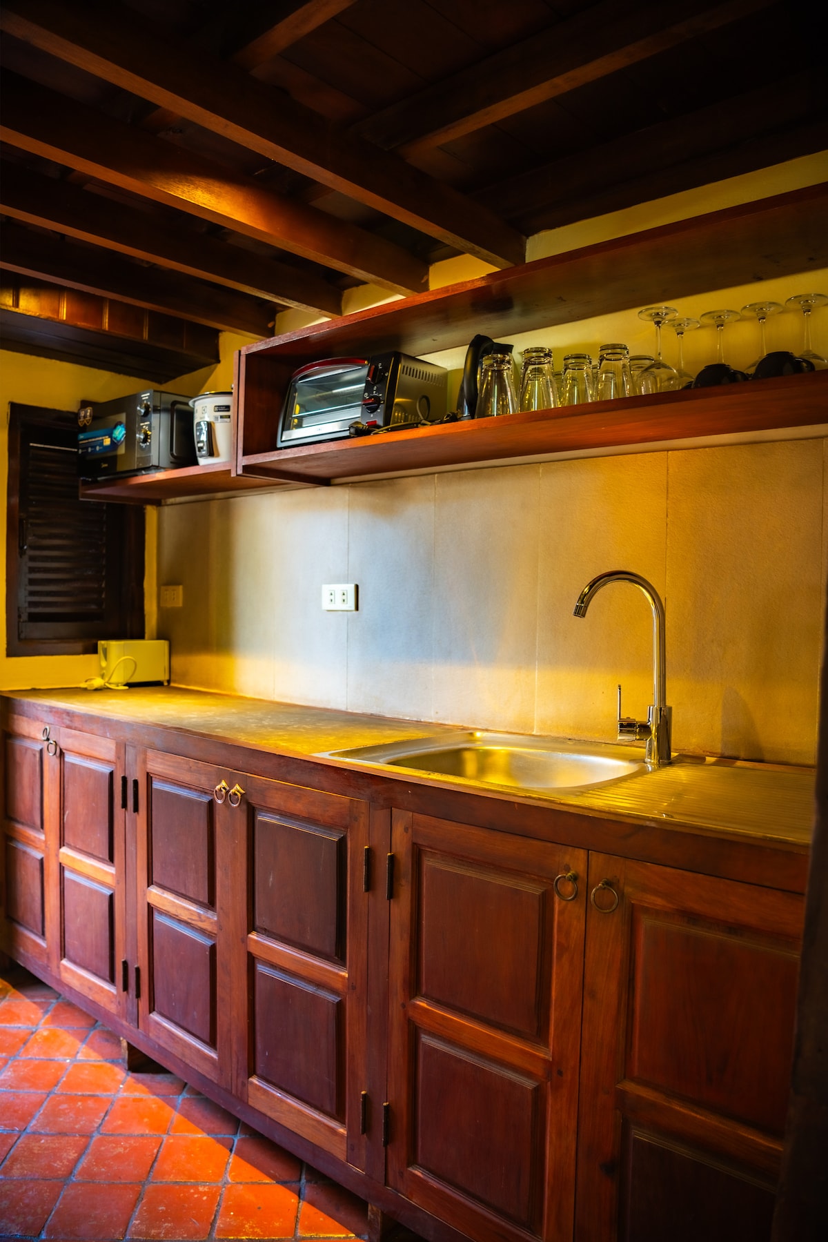 Tapınak arazisindeki bu harika Fransız sömürge evi, miras listesinde yer alan bir hazinedir ve keyfini çıkarmanız için tamamen size aittir. Geniş alanıyla sessiz ve tenha, ancak canlı ve hareketli sokak hayatı hemen köşe başında. Huzurlu büyüleyici Wat Aphay'ın yanında gerçekten dikkat çekici bir konum. 4 kişilik üst kattaki bu klasik konut, tek banyolu iki adet king boy yatak odasına (4x4 m) sahiptir. Ana yaşam alanı, konforlu bir salon TV odası ve yemek düzeni, Rosewood ofis masası ve yenilenmiş mutfak ile sade bir yerdir.
