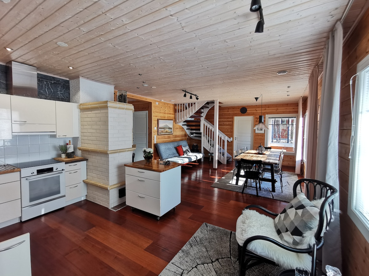 İki nehrin kesiştiği noktada geniş bir arsa üzerinde kendi huzurunuzda atmosferik eski bir Lappi evi. Kütük kulübede iki yatak odası, bir oturma odası ve bir banyo/tuvalet bulunmaktadır. Altı kişilik tam donanımlı mutfak ve sofra takımı. Kulübe 4 kişiyi barındırabilir. Sauna kabininde odunla ısıtılan bir sauna bulunmaktadır. Mekânlar ayrılmadan önce müşteri tarafından temizlenmelidir veya 170 Euro temizlik hizmeti seçilebilir. Yatak takımı ve havlular mevcuttur.