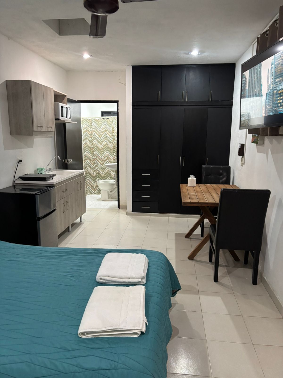 Depto tipo Estudio, moderno, cómodo y bien equipado, ubicado en excelente zona al NORTE de Merida (no CENTRO), acceso rápido a Centros comerciales, Restaurantes, Bancos, Museos y Puerto Progreso (playa). Ideal para trabajo, vacaciones o fin de semana. Centro Comercial Galerias y Gran Plaza a 5min en vehículo, La Isla Merida y Plaza Altabrisa a 15min. Caminando queda: Centro de Convenciones 18min Escuela Bancaria y Comercial (EBC) 12min Plaza comercial Altana 12min Chedraui Selecto 15min