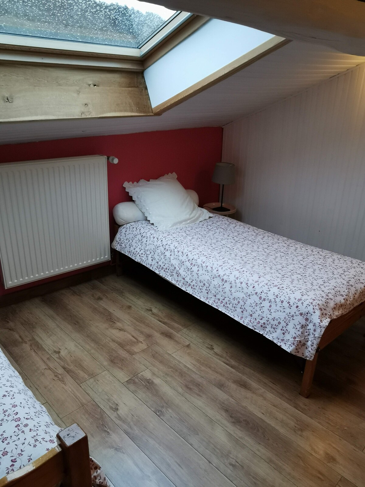 Odalarımız evin 2. katındadır. 4 yatak odası ve 1 müşterek banyo bulunmaktadır. Son derece huzurlu. Bu odada mikrodalga fırın, tabaklar ve su ısıtıcısı vardır. Ayrıca bir ofis de var. Bahçenin yanı sıra ortak bir mutfak da mevcuttur. Ayrıca 12 € karşılığında jakuziye erişiminiz vardır. Kahvaltı cömert ve çeşitlidir (12). 15 kişilik yemek tepsisi sunuyoruz. Öğrenciler, çalışanlar veya diğerleri için uygundur.
